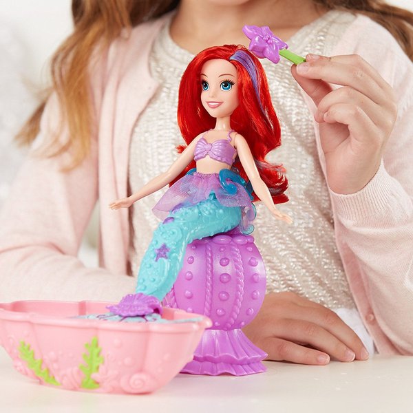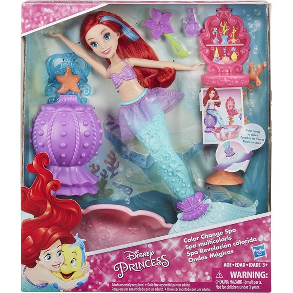 Teraz możesz zabrać księżniczkę ze sobą do spa, Arielce przyda się trochę relaksu! Zanurz piękny długi ogon syrenki w wodzie i obserwuj jak zmienia kolor - coś niesamowitego! Dodatkowo do zestawu zostało dołączone wygodne krzesełko, wanienka w kształcie muszelki, toaletka oraz gąbeczka, która po zanurzenia może zmieniać kolor muszelek na ogonie syrenki.