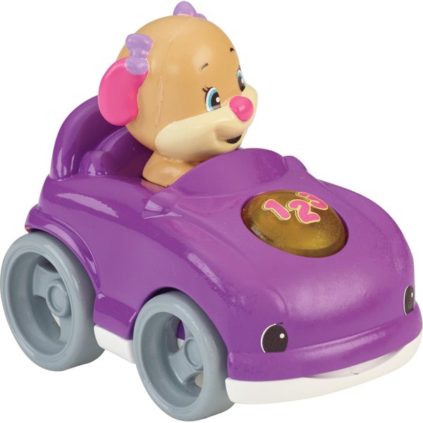 Urocza Siostrzyczka Szczeniaczka zaprasza do wspólnej zabawy. Samochodzik przyjeżdża z piosenkami i wesołymi dźwiękami. Naciśnij przycisk na samochodziku, aby włączyć odgrywanie piosenek, melodyjek i nagrań edukacyjnych, które wprowadzą maluszka w świat nauki liczb. Siostrzyczka chętnie nauczy maluszka rozpoznawania koloru fioletowego. Światełka migoczące podczas odgrywania dźwięków i piosenek dodatkowo zaciekawią maluszka!