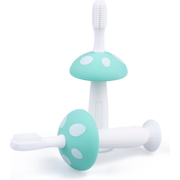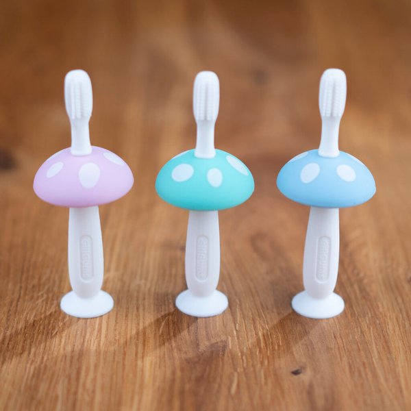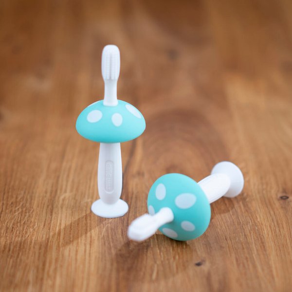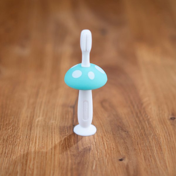 Szczoteczka do pierwszych ząbków, która pozwoli dziecku wyrobić zdrowy nawyk czyszczenia ząbków. Będą mogły dbać o nie w momencie, gdy pojawi się pierwszy z nich. W zestawie znajduje się rączka ozdobiona kapeluszem grzybka oraz trzy wymienne końcówki, które różnią się kształtem oraz ułożeniem wypustek. Oprócz czyszczenia ząbków, pozwolą one delikatnie masować dziąsełka. Szczoteczka wykonana została z miękkiego silikonu, który jest higieniczny i bezpieczny dla maluszka. Jest ona bardzo prosta do wyczyszczenia, dzięki czemu zachowamy ją w higienicznej czystości, gotową do użycia.