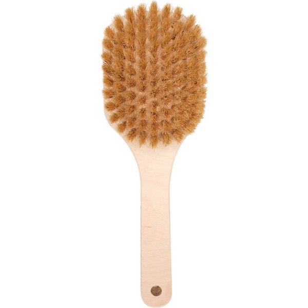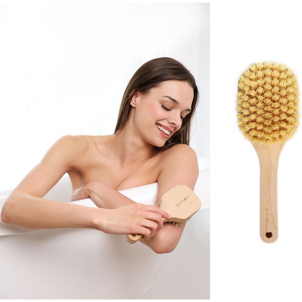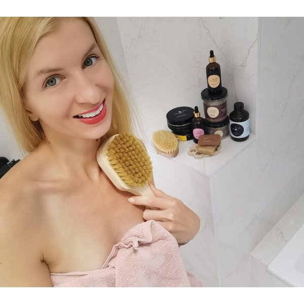 Ten model szczotki posiada średnio twarde włosie - szczecinę, odpowiednie dla osób z wrażliwą skórą oraz tych, którzy dopiero zaczynają przygodę ze szczotkowaniem ciała. Dzięki długiej rączce szczotka pozwali Ci na skuteczny peeling i masaż nawet trudno dostępnych rejonów ciała, takich jak plecy czy stopy. Rama i rączka szczotki zostały wykonane z kilku sklejonych razem płatów drewna, co zapobiega jej pękaniu po kontakcie z wodą.