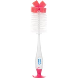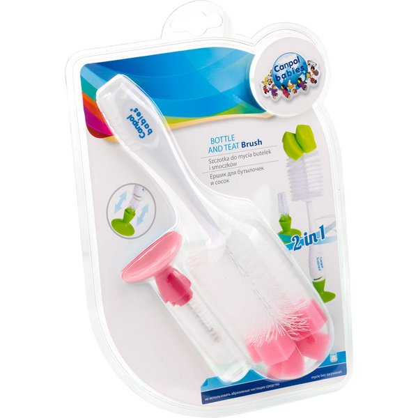 Specjalnie zaprojektowana szczotka do czyszczenia butelek i smoczków przed ich dezynfekcją termiczną. Materiał z którego została wykonana nie powoduje zarysowań. Dwa połączone ze sobą elementy zapewnią dokładne wyczyszczenie akcesoriów. Większa szczotka służy do mycia butelek, a mniejsza do smoczków. Praktyczna przyssawka umożliwia jej stabilne ustawienie na każdym podłożu.Od czasu do czasu należy wyparzać włosie szczotki wrzątkiem.