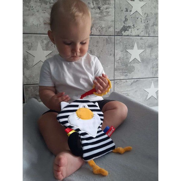 Szeleścik od Mom's Care, który jest niezwykle przyjemny w dotyku oraz posiada różne struktury materiałów. Oprócz delikatności cechuje go również bezpieczeństwo, nie powoduje podrażnień skóry. Został wypełniony folią, która będzie wydawała szeleszczące odgłosy, zachęcając jednocześnie maluszka do zabawy. Wyposażony został również w dodatkowe, wystające elementy, które umilą czas, a przy okazji będą rozwijały zdolności motoryczne i koordynację.
