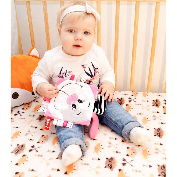 Szeleścik od Mom's Care, który jest niezwykle przyjemny w dotyku oraz posiada różne struktury materiałów. Oprócz delikatności cechuje go również bezpieczeństwo, nie powoduje podrażnień skóry. Został wypełniony folią, która będzie wydawała szeleszczące odgłosy, zachęcając jednocześnie maluszka do zabawy. Wyposażony został również w dodatkowe elementy takie jak: metki, uczy i język, które umilą czas, a przy okazji będą rozwijały zdolności motoryczne i koordynację.