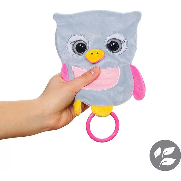 Zabawka szeleszcząca sowa, kolorowa, bardzo ładna, z miękkiego weluru , z przymocowanym u dołu gryzakiem - kółeczko.