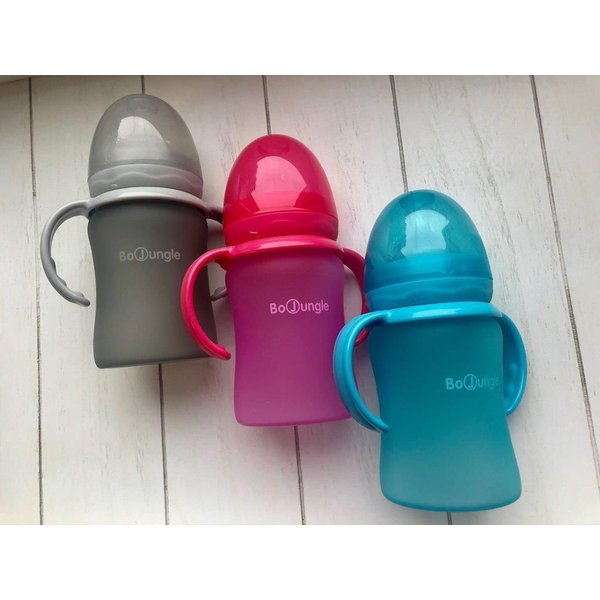 Szklana butelka od Bo Jungle w połączeniu z dodatkową, silikonową warstwą pozwala na bezpieczne użytkowanie jej przez maluchy bez lęku, że stłucze się ona podczas upadku. Dzięki temu nie musimy się obawiać, że dziecko się skaleczy lub uszkodzi butelkę. Dodatkowo reaguje ona na zbyt gorące napoje (od +40oC). Po kontakcie z tak gorącą cieczą, zmienia swój kolor na biały. Nie musimy się, więc obawiać, że podamy dziecku za gorące mleko, którym mogłoby się oparzyć. W zestawie znajduje się również smoczek, który przypomina kształtem pierś mamy co ułatwi łączenie naturalnego karmienia z karmieniem z butelki. System odpowietrzania pozwoli na picie mleka w taki sposób, aby dziecko jak najmniej łykało powietrze i było mniej narażone na kolki.