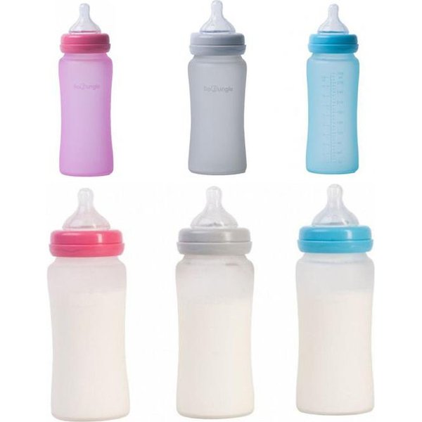Szklana butelka od Bo Jungle w połączeniu z dodatkową, silikonową warstwą pozwala na bezpieczne użytkowanie jej przez maluchy bez lęku, że stłucze się ona podczas upadku. Dzięki temu nie musimy się obawiać, że dziecko się skaleczy lub uszkodzi butelkę. Dodatkowo reaguje ona na zbyt gorące napoje (od +40oC). Po kontakcie z tak gorącą cieczą, zmienia swój kolor na biały. Nie musimy się, więc obawiać, że podamy dziecku za gorące mleko, którym mogłoby się oparzyć. W zestawie znajduje się również smoczek, który przypomina kształtem pierś mamy co ułatwi łączenie naturalnego karmienia z karmieniem z butelki. System odpowietrzania pozwoli na picie mleka w taki sposób, aby dziecko jak najmniej łykało powietrze i było mniej narażone na kolki.