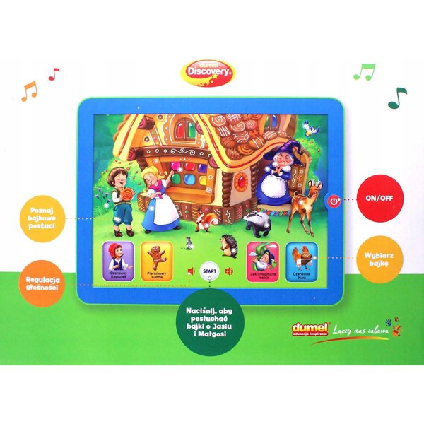 Tablet edukacyjny "Bajkowy Świat" do Dumel wprowadzi malucha w niesamowity świat pełen kreatywności i wyobraźni. Wyposażony został w cztery bajki, które zna każdy z nas, a teraz może się z nimi zapoznać maluch. Oprócz tego posiada on zabawne dźwięki oraz sprawi, że przemówią do nas bajkowe postacie. To nie lada gratka dla maluszków! To również świetna alternatywa dla tabletów i smartfonów. Pozwoli rozwinąć wyobraźnię i pozytywnie wpłynie na trenowanie pamięci.
