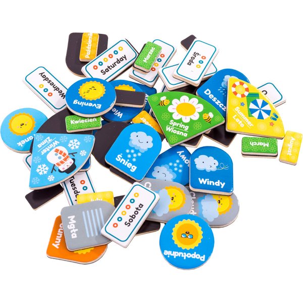 • Dwujęzyczne (PL i ENG) akcesorium do nauki: pór roku, miesięcy, pogody, dni tygodnia, pór dnia,