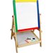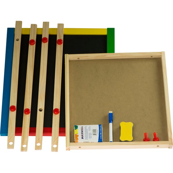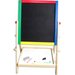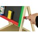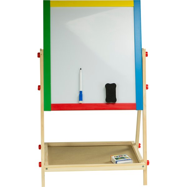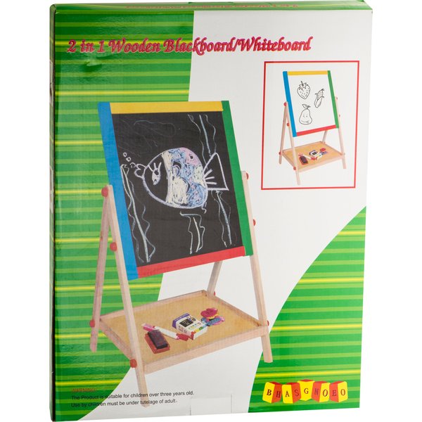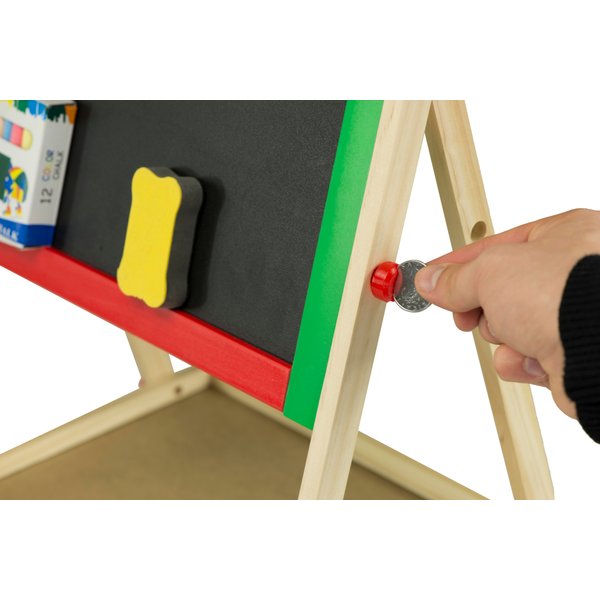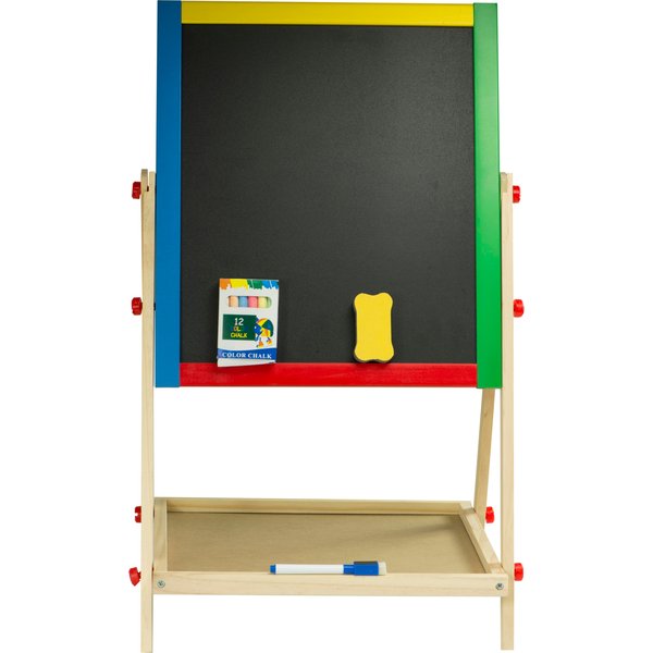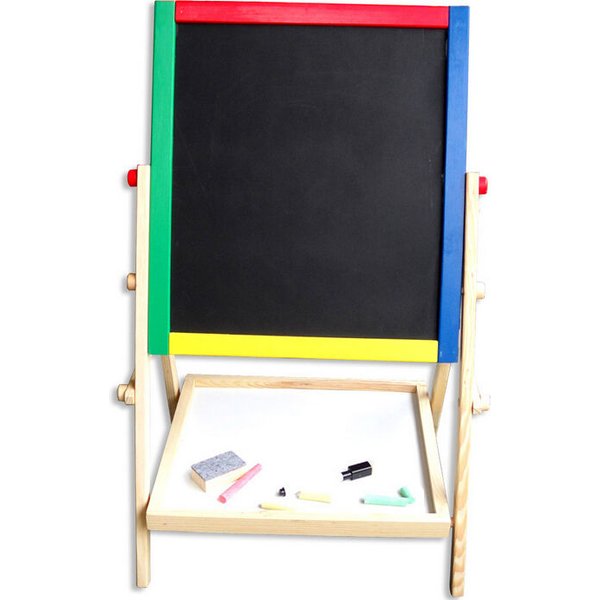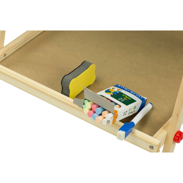 Dwustronna tablica dla dzieci, która daje wiele możliwości jej wykorzystania. Składa się z tradycyjnej części po której można pisać kredą. Dodatkowo po białej stronie można malować mazakiem suchościeralnym i przyczepić magnesy. Maluchy będą mogły bawić się w szkołę lub trenować rysowanie bez marnowania papieru. Do wyposażenia zostały dołączone wszystkie najpotrzebniejsze elementy. Do dyspozycji dziecko będzie miało m.in. drewnianą półeczkę, kredę, mazak czy gąbkę do wycierania. Stabilny stelaż zapewni bezpieczeństwo podczas zabawy.