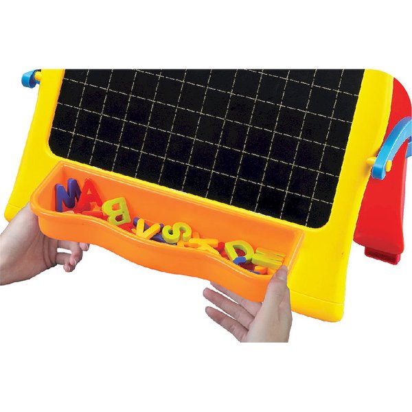 Tablica wykonana została z plastiku, więc w razie gdyby malucha poniosło z twórczością, bez problemu doprowadzimy ją do porządku. Specjalny pojemnik pozwoli przechowywać wszystkie elementy dołączone do zestawu, co pozwoli na zachowanie porządku. Sama tablica składa się z dwóch części - magnetyczną/kredową i białą suchościeralną po której bez problemu możemy pisać dołączonym pisakiem. Do zestawu dołączone zostały magnetyczne literki, które wprowadzą malucha w świat alfabetu.