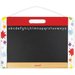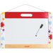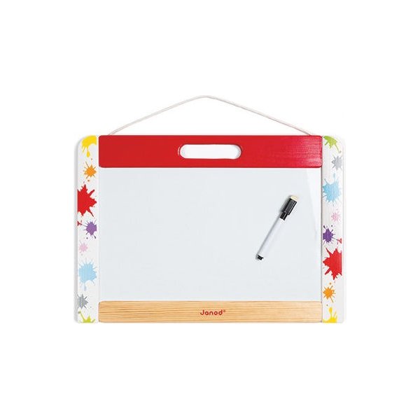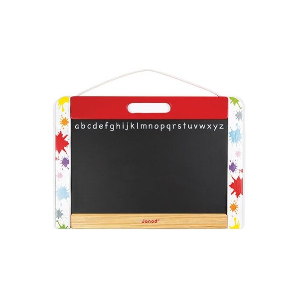 Tablica wielofunkcyjna to świetny prezent dla małych artystów. Na dwustronnej tablicy maluch może rysować kredami, pisać flamastrami, a nawet przyczepiać magnesy z literkami. Na białej stronie można pisać markerem, który znajduje się w zestawie natomiast czarną stronę można wykorzystać na 2 sposoby: pisać po niej kredami (znajdują się w zestawie) lub układać na niej drewniane literki magnetyczne - w zestawie znajduje się 26 kolorowych literek.
