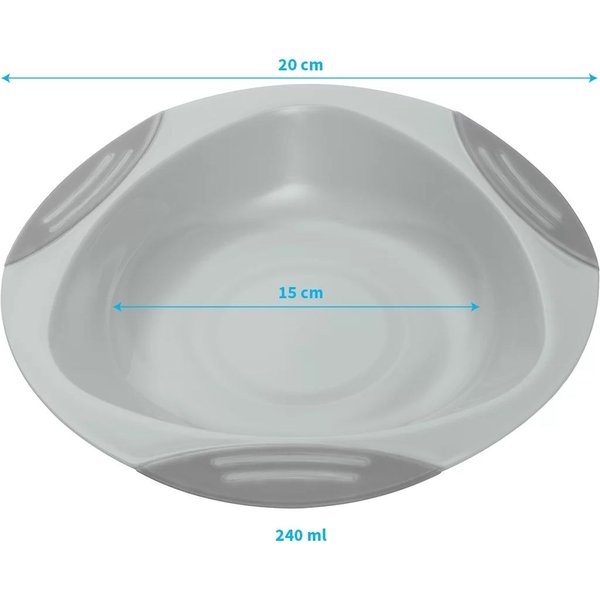 Naczynie zostało wykonane z całkowicie bezpiecznych dla dziecka materiałów, bez szkodliwego Bisfenolu A. Praktyczna gumowa przyssawka zapobiega przypadkowemu przewróceniu i ślizganiu się talerza, ułatwiając maluchowi samodzielne jedzenie. Dodatkowe korzyści to możliwość mycia w zmywarce i podgrzewania posiłków w kuchence mikrofalowej.