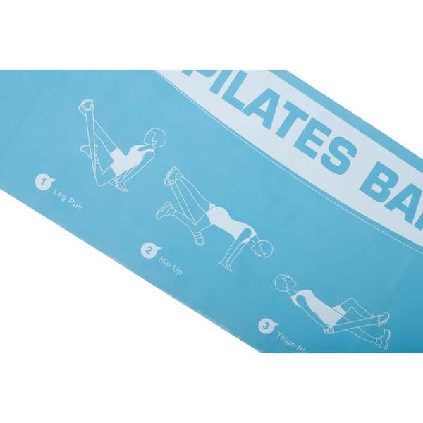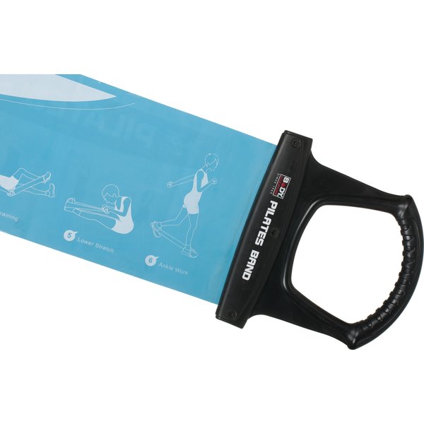 Taśma pilates z uchwytami umożliwia wygodny i efektywny trening siłowy i koordynacyjny. Niebieska taśma z lateksu z nadrukowanymi przykładowymi ćwiczeniami kształtującymi i modelującymi różne części ciała. Wygodne, ergonomicznie wyprofilowane, giętkie uchwyty zapewniają pewny i bezpieczny chwyt. W jednym uchwycie umieszczony dodatkowo pas o regulowanym obwodzie do zamocowania na stopie
