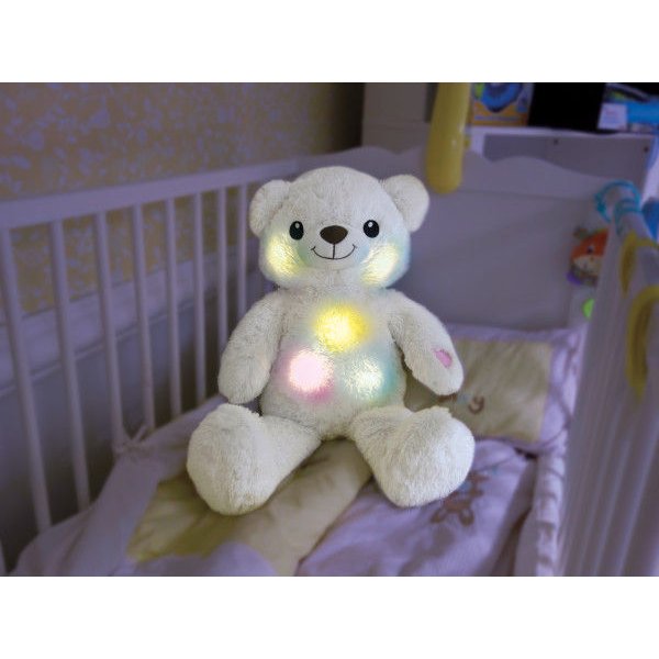 Miś wykonany jest z niezwykle miękkiego i przyjemnego w dotyku materiału, który jest całkowicie bezpieczny dla delikatnej skóry dziecka. Będzie idealnym towarzyszem do drzemki i szybko utuli Twojego maluszka do snu. Wystarczy nacisnąć na łapkę z serduszkiem, a zabawka odegra kojącą melodię oraz uruchomi pokaz kolorowych światełek - maluszek będzie zachwycony!