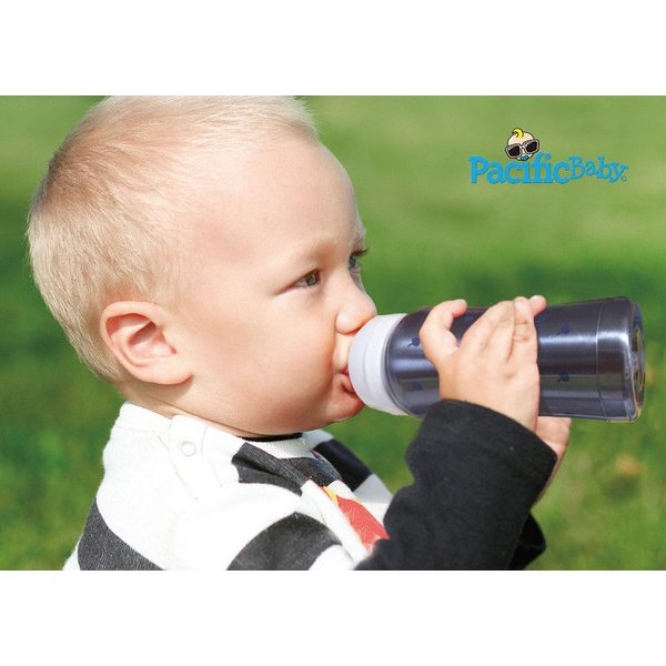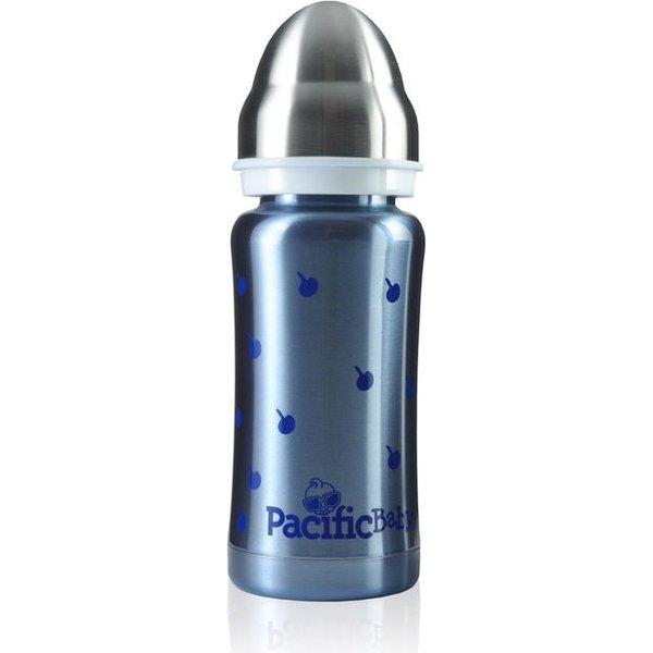 Termobutelka ze smoczkiem Pacific Baby wykonana jest z antybakteryjnej   stali nierdzewnej. Produkt Pacific Baby to idealny sposób na przejście ze smoczka na kubek niekapek. Możemy wlewać do niej zarówno ciepłe jak i zimne napoje. Temperatura utrzymuje się do ok. 10 godzin. Co ważne mleko  przechowywane w butelce chronione jest  przed światłem. W środku butelki znajduje się miarka. Termobutelka  posiada szeroki wlew co również ułatwi mycie.