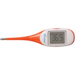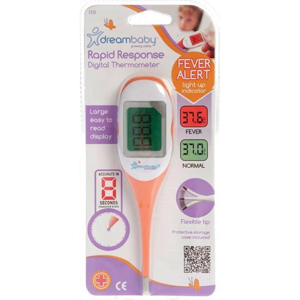 Termometr cyfrowy z miękką końcówką i dużym wyświetlaczem marki Dreambaby zapewni łatwy i dokładny pomiar temperatury. Jego elastyczna końcówka zapewnia bezpieczne mierzenie temperatury. Łatwy w obsłudze, a dla Twojej wygody wyświetlacz zapala się na czerwono, gdy temperatura dziecka przekracza 37°C. Jeśli temperatura dziecka jest w normie to wyświetlacz świeci się na zielono.