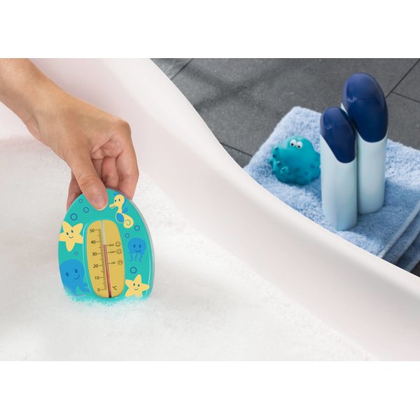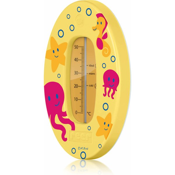 Reer to renomowana niemiecka marka produkująca artykuły dziecięce, która istnieje na rynku już od 1922 roku. Bezrtęciowy termometr do kąpieli, bezpieczny dla Twojego maluszka. Pozwoli Ci dokładnie zmierzyć temperaturę wody, a ciekawy wzór będzie atrakcją podczas kąpieli. Posiada wyraźną miarkę i oznaczenia informujące rodziców o tym czy woda nie jest za ciepła bądź za zimna. Prawidłowa temperatura wody powinna wynosić 37 stopni Celsjusza i jest oznaczona na skali uśmiechniętą buźką.