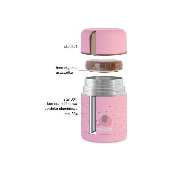 Termos marki Miniland wykonany został ze stali nierdzewnej i świetnie sprawdzi się do przechowywania posiłków. Jego pojemność to 600 ml.