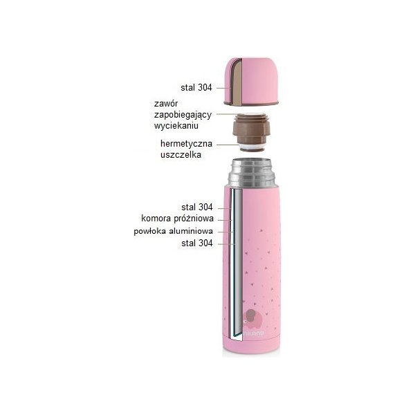 Termos posiada przycisk blokujący, który zabezpieczy przed przeciekaniem. Zamknięcie termosu może służyć również jako kubeczek do picia - co jest bardzo praktyczne.
