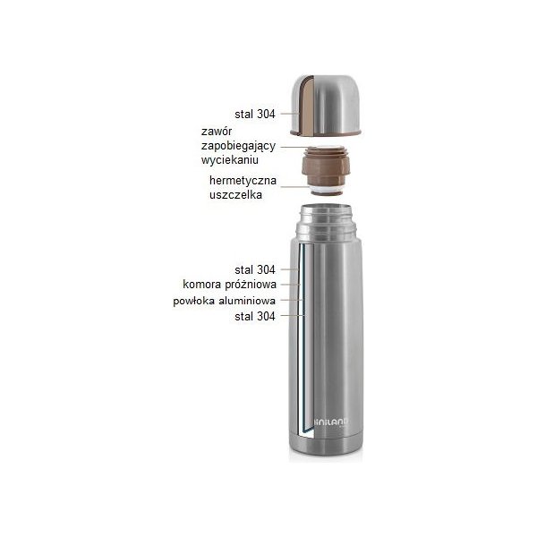 Termos posiada podwójną ściankę ze stali nierdzewnej oraz izolacyjną ściankę zewnętrzną. Potrafi utrzymać ciepło nawet do 12 godzin a zimne napoje nawet do 24 godzin.