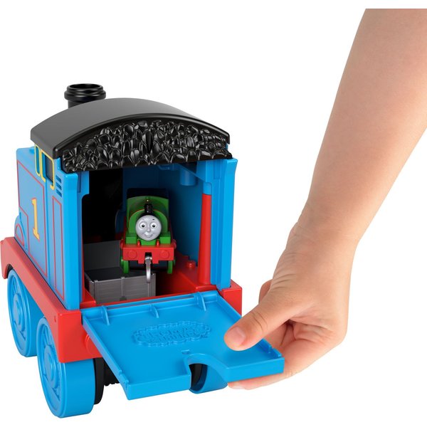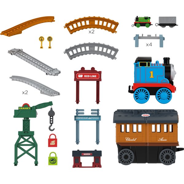 Lokomotywa Tomek jeżdżąc po torach Sodoru popycha dwa duże wagony pasażerskie: Anię i Klarę. Może im towarzyszyć metalowa lokomotywa Piotruś oraz dźwig Karolek, niezbędny do rozładunku ciężkich towarów. Wagony kryją w sobie niespodziankę - zestaw torów do zbudowania całej trasy! Jeśli chcesz rozbudować zestaw, możesz dokupić tory z linii Tomek i Przyjaciele (będą pasować wszystkie, poza drewnianymi). Dłuższa trasa to więcej przygód!