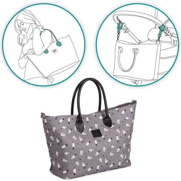 W zestawie znajdują się również uchwyty, które pozwolą zaczepić torbę na różnego rodzaju wózkach. Oprócz tego torba wyposażona jest również w matę do przewijania, która wzorem pasuje do torby, a która jest niezbędna podczas pobytu z maluchem poza domem.