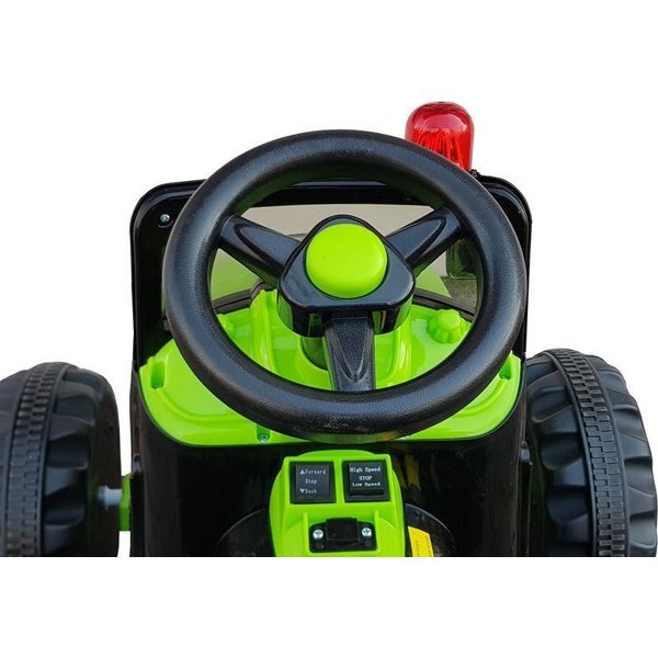 Zasilany jest podwójnym akumulatorem o łącznej mocy 2x6V7Ah oraz dwoma silnikami 2x45W. To umożliwia poruszanie samochodem z prędkością od 2-5 km/h. Wyposażony został w fotel z tworzywa sztucznego do którego dołączone zostały pasy bezpieczeństwa. Pojazd rusza za pomocą guziku start, wybraniu odpowiedniego kierunku oraz prędkości jazdy i naciśnięciu pedału gazu. Dziecko do dyspozycji ma obrotową kierownicę oraz panel terowania. Traktor zachwycać będzie imitacją czerwonego światełka czy innymi detalami obok, których nie będziemy w stanie przejść obojętnie. Wykonany z materiałów wysokiej jakości gwarantuje trwałość i wytrzymałość.