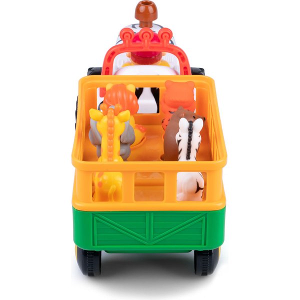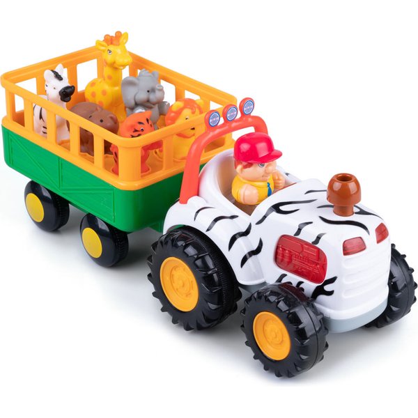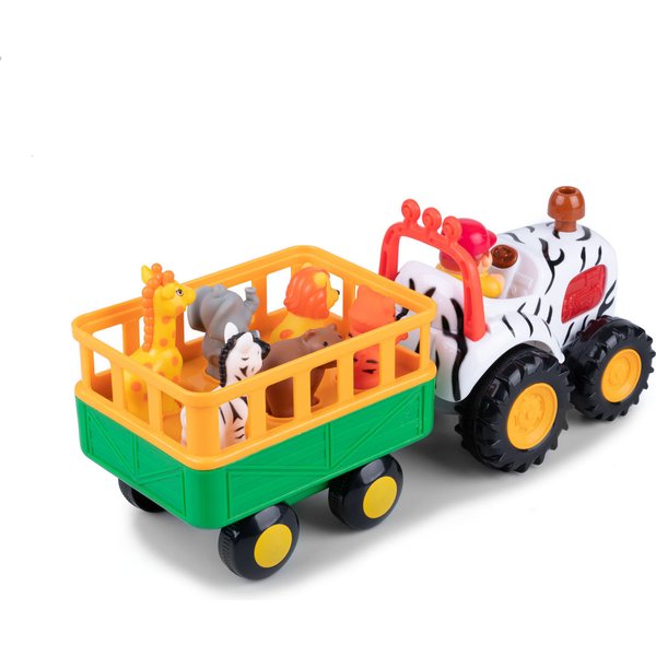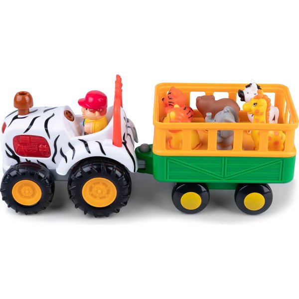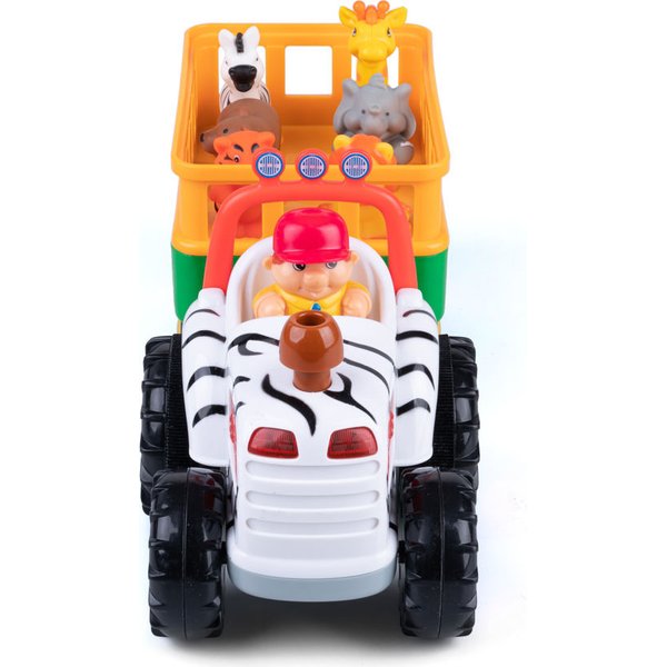 Na przyczepie siedzi 6 zwierzątek, które nagrodzą dziecko dźwiękami, gdy tylko odgadną prawidłowy kształt i usadowią zwierzątko w odpowiednie miejsce. Po naciśnięciu komina traktor przez chwilę samodzielnie jedzie wydając realistyczny odgłos silnika. Naciśnięcie fotela kierowcy spowoduje, że popłynie dźwięk wesołej melodyjki. Gdy Dziecko naciśnie kierownicę można usłyszeć dźwięk klaksonu, a światła traktora zaczną mrugać.