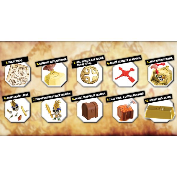 Zestaw skrywa w sobie bohaterów bajki i cenne skarby! W sumie mamy aż 10 warstw niespodzianek do odkrycia. Twoim zadaniem jest znaleźć mapę, odkryć monetę i zapoznać się ze swoją misją do wykonania. Następnie należy znaleźć narzędzie i zacząć kopać, aby odkryć skrzynię skarbów. Po znalezieniu skarbu trzeba do niego wlać wodę - zawartość zacznie musować i skarb zostanie odkryty.