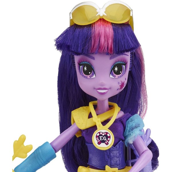 Twilight Sparkle ma na sobie kolorowy, sportowy strój. Głowę zdobią żółte okulary, zaś szyję złoty medal Equestria Girls.