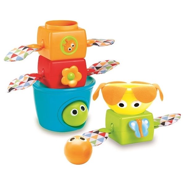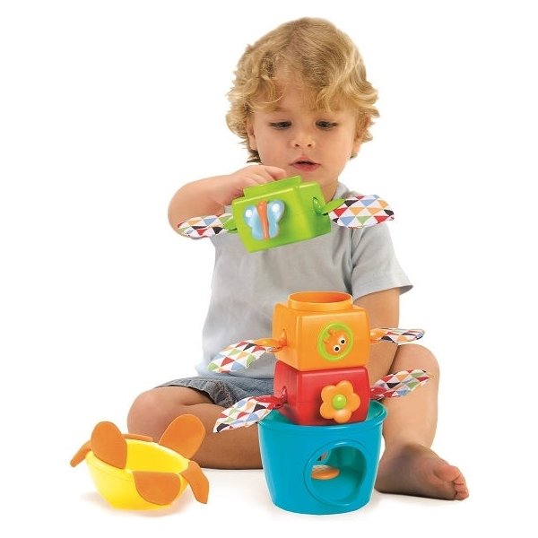 Dziecko może sortować i układać kolorowe elementy na podstawie w kształcie donicy w dowolnej kolejności, a szczyt piramidki udekorować żółtym kwiatuszkiem. To jednak nie koniec atrakcji! W zestawie znajdują się trzy kolorowe piłeczki, maluch może je wrzucać do środka wieży, by obserwować poruszające się listki i uruchomić wesołą melodię.