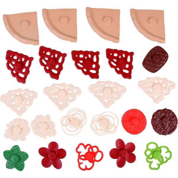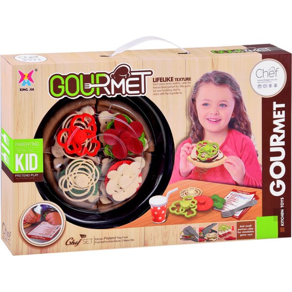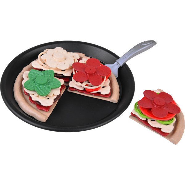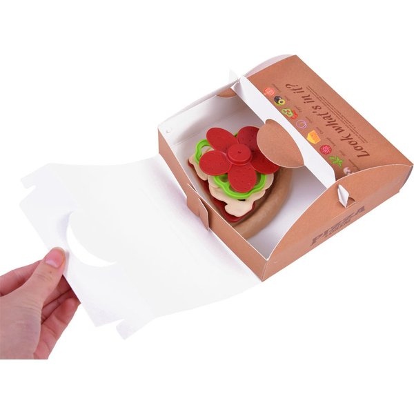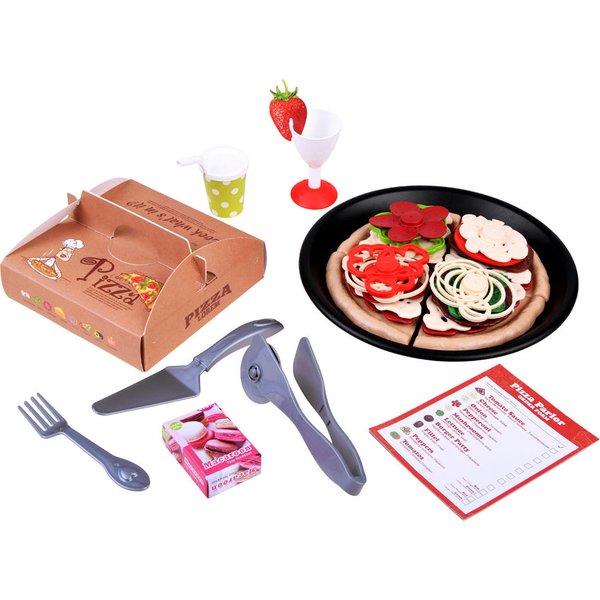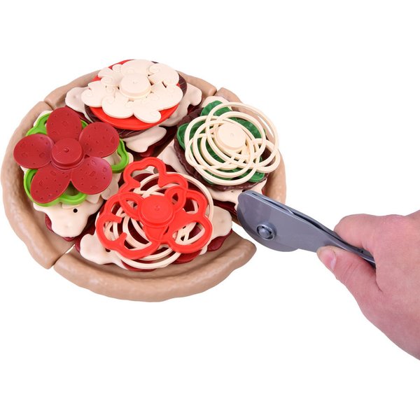 W opakowaniu znajdziesz mnóstwo kolorowych elementów, z których można ułożyć najpyszniejszą i zarazem najpiękniejszą pizzę na świecie. Ta bajecznie kolorowa i pełna warzywnych dodatków potrawa jest idealna do dzielenia się z przyjaciółmi. Ozdabianie pizzy pomaga nie tylko w rozwoju zdolności manualnych, ale także w zwiększaniu kreatywności Twojej pociechy. Jednocześnie dziecko uczy się, że każda potrawa, nawet typowy fast food, może mieć swoją zdrowszą wersję z dużą ilością kolorowych warzyw. W zestawie jest także małe pudełko do pakowania pizzy na wynos - w sam raz do zabawy w małego pizzermana.