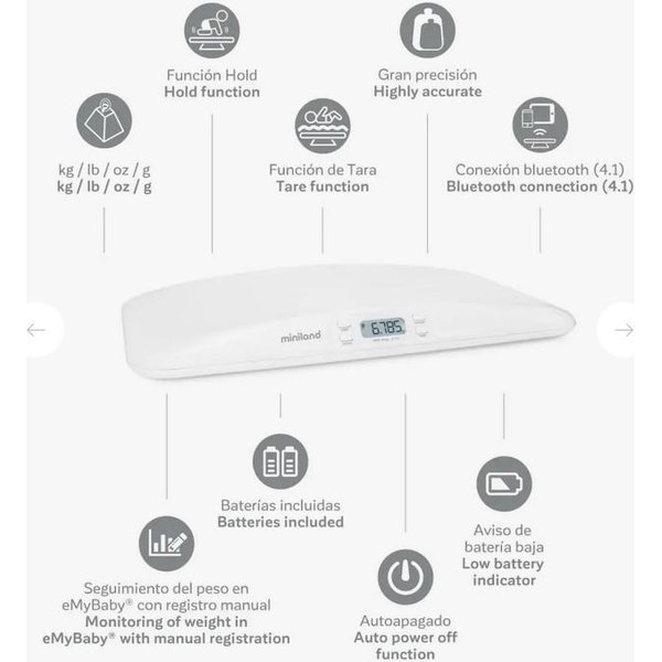 Dokładne kontrolowanie wagi i obserwowanie prawidłowości tempa przybierania na wadze będą jeszcze łatwiejsze, jeśli zainstalujesz na swoim smartfonie aplikację eMyBaby. Ważną zaletą urządzenia jest funkcja oszczędzania energii, wyłączająca urządzenie po minucie oraz dioda ostrzegająca przed wyczerpaniem baterii.
