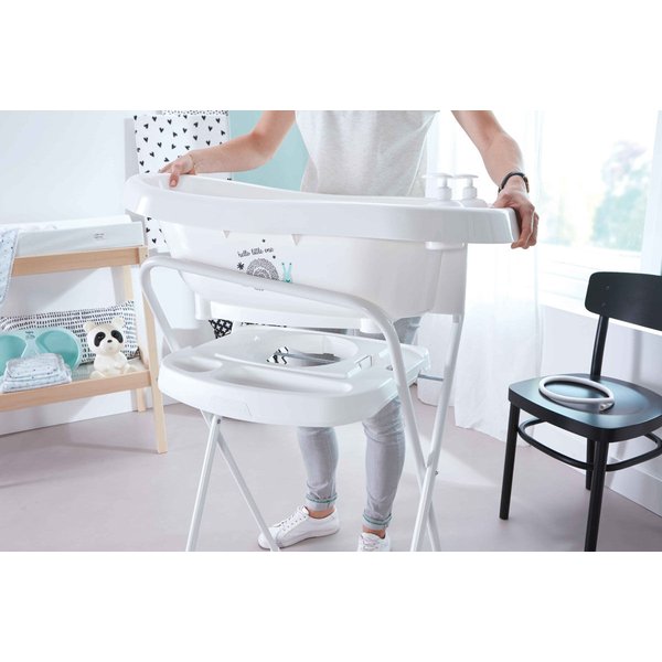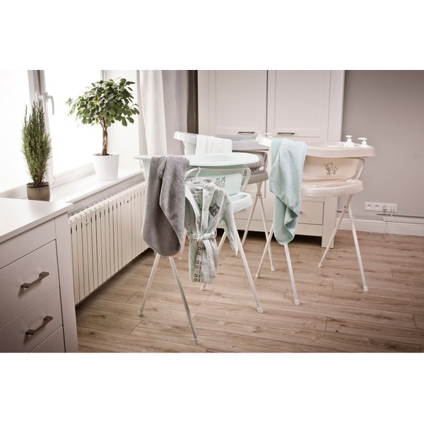 marki Bebe-Jou przeznaczony jest do wanienek oraz wiaderka kąpielowego tej samej firmy. Jest wysoki, wygodny oraz stabilny. Posiada specjalną półeczkę na akcesoria typu termometr i mydełko oraz miejsce na zawieszenie ręcznika. Szybko i łatwo można go rozłożyć, a po złożeniu zajmuje naprawdę niewiele miejsca. System Click gwarantuje bezpieczne połączenie z wanienką lub wiaderkiem.