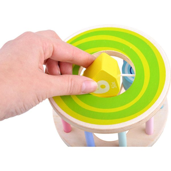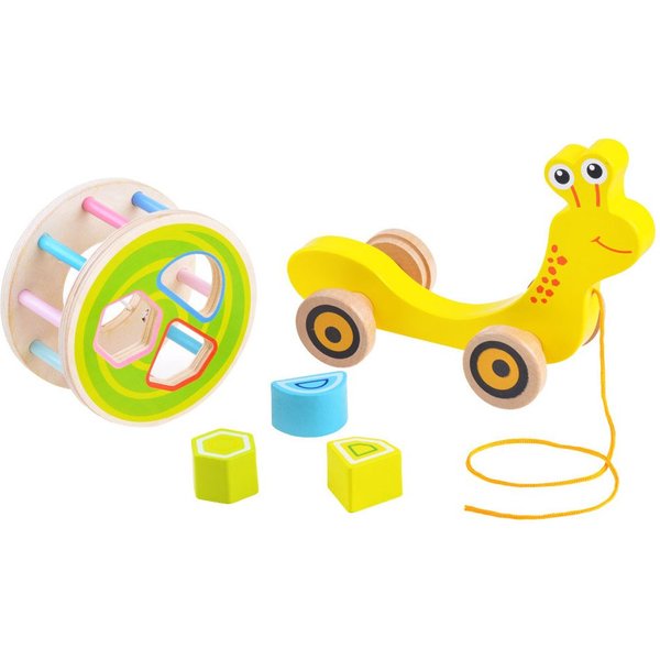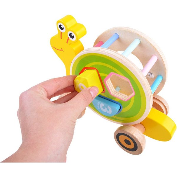 Atrakcyjne dla Twojego dziecka kolory, estetyczne wykończenie, przykuwające wzrok zabawki to duże atuty tego sortera. Trzy kolorowe klocki, które maluch ma umieścić w specjalnych otworach ozdobione zostały cyframi, aby już od najmłodszych lat rozpocząć edukację poprzez zabawę. Zróżnicowane kształty i kolory dopingują dziecko do nauki ich właściwego rozpoznawania i nazywania. Mały sznurek pozwala na zabranie ślimaka na spacer, dzięki czemu uruchamia się kręcący kołowrotek w kształcie muszki.