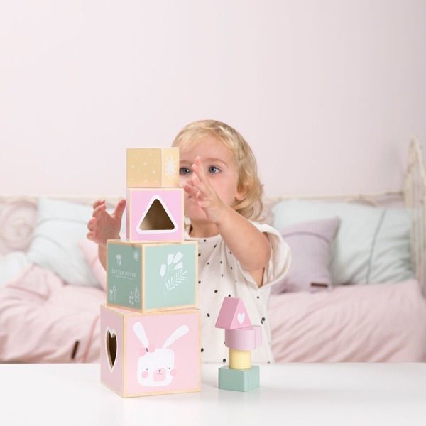 Drewniana wieża składa się z 4 klocuszków, na których umieszczone są delikatne wzory. Jedna strona klocków to otwory, do których należy dopasować elementy. Dziecko może układać klocuszki jedno na drugim tworząc wspaniałą wieżę z pięknymi ilustracjami - szykuje się cudowna zabawa! Całość zapakowana w piękne pudełko idealne na prezent!