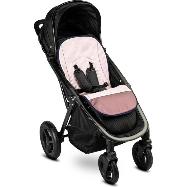 Miękka wkładka do wózka z wodoodpornym podnóżkiem poprawi komfort twojego malucha podczas jazdy wózkiem, a ponadto doda mu niesamowicie oryginalnego stylu. Specjalnie wyprofilowany kształt zapewni, że prawidłową dopasuje się do wózeczka. Wkładka jest dwustronna. Z jednej strony gładka bawełna ze wzorem, z drugiej strony materiało strukturze wafla. Posiada otwory na pasy co sprawia, że idealnie pasuje do większości wózków spacerowych. Pozwala utrzymać wózek w czystości i zapewni komfort podczas spacerów.