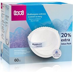 Wkładki laktacyjne są przeznaczone do używania przez całą dobę. Materiał przepuszczający powietrze chroni przed podrażnieniami piersi oraz umożliwia regenerację uszkodzonego naskórka i pokaleczonych sutków. Miękka wyściółka wchłania wypływające z piersi mleko, a bielizna pozostaje sucha. Wysoka chłonność umożliwia korzystanie z jednej wkładki nawet przez całą noc, a młoda mama może cieszyć się wyższym komfortem snu.