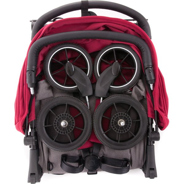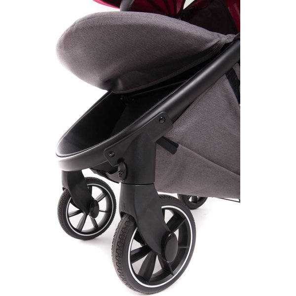 Wyposażony został w amortyzowane, gumowe koła, którą biorą czynny udział w poprawie komfortu prowadzenia. Ten fakt pewnością ucieszy rodziców, którzy lubią spacerować leśnymi ścieżkami. Zapewnią płynną jazdę, niezależnie od nawierzchni. Przednie, obrotowe koła posiadają możliwość zablokowania ich gdy zajdzie taka konieczność.