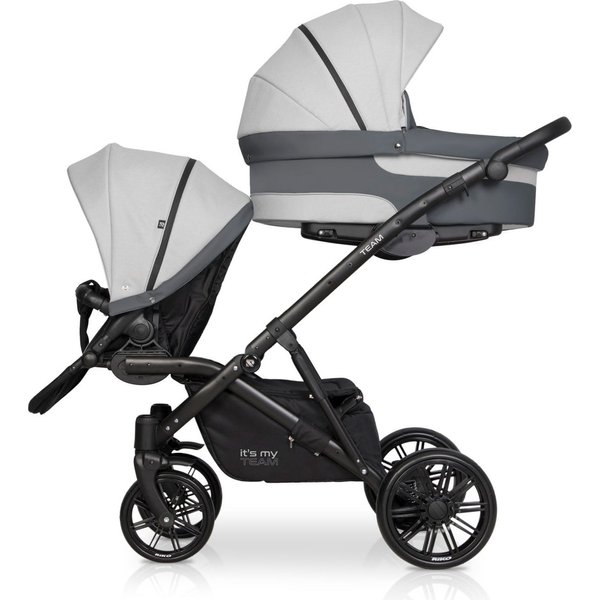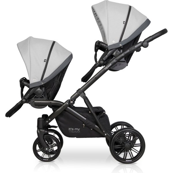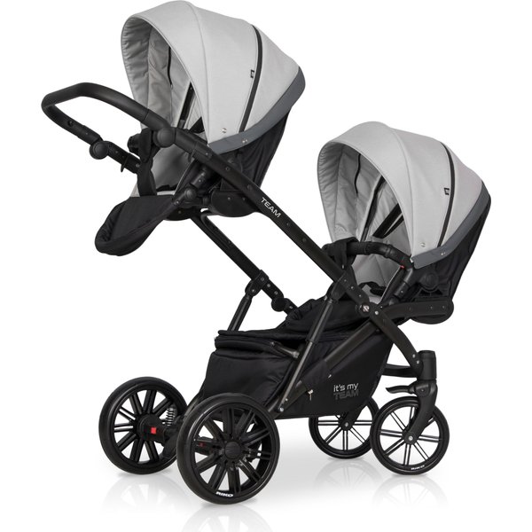 Model Team to również wygoda podczas prowadzenia. Dzięki łożyskowanym kołom z oponami i możliwością regulacji zawieszenia, zapewni płynną i lekką jazdę, niezależnie od rodzaju nawierzchni po, której się poruszamy. Świetnie sprawdzi się zatem zarówno nie tylko podczas spaceru po miejskich drogach, ale również poza nim. Możliwość ustawienia siedzisk przodem lub tyłem oraz przodem do siebie, pozwoli dostosować ustawienie pod własne wymagania. Siedzisko możemy rozłożyć do pozycji leżącej, co pozwoli na drzemkę podczas spacerów w wygodnej pozycji. Bezpieczeństwo zapewnią 5 punktowe pasy oraz barierka. Obecny jest również duży kosz na zakupy, ktory umożliwi zabranie ze sobą najpotrzebniejszych rzeczy.