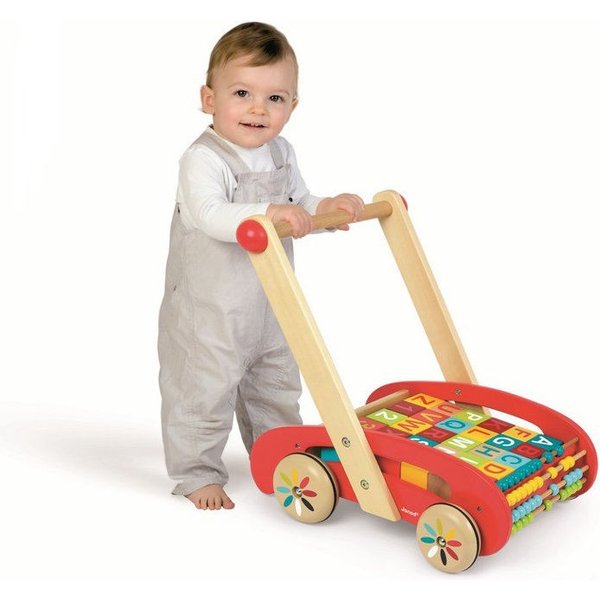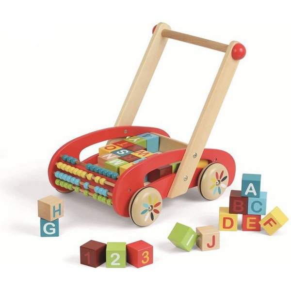 Drewniany wózek z klockami marki Janod wykonany został z drewna, nie posiada żadnych ostrych krawędzi i jest bezpieczny dla dziecka. Wspomaga malucha w stawianiu pierwszych kroków. Wózek posiada 4 koła wykończone gumą, dzięki czemu produkt jest bezpieczny do użytkowania w domu.