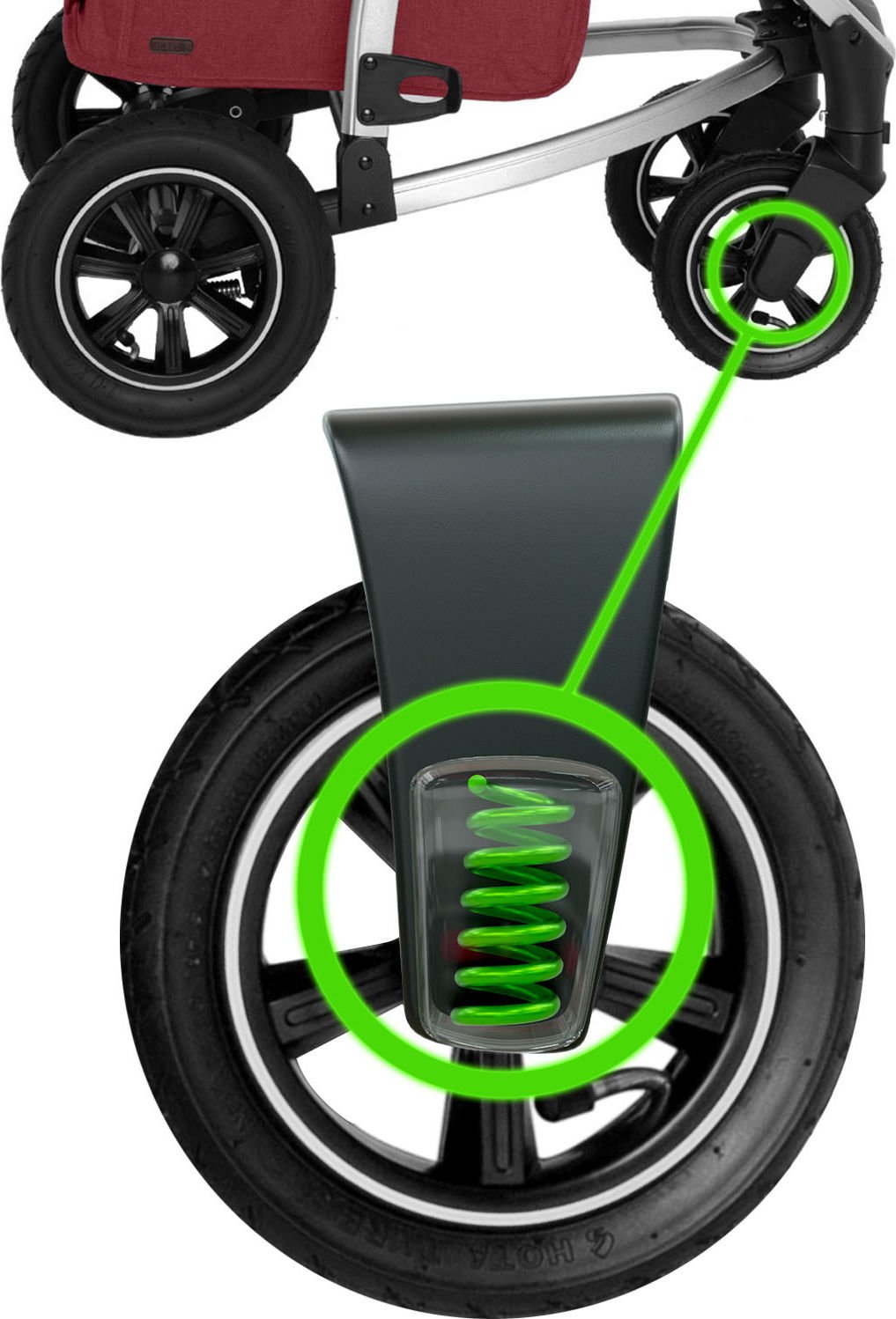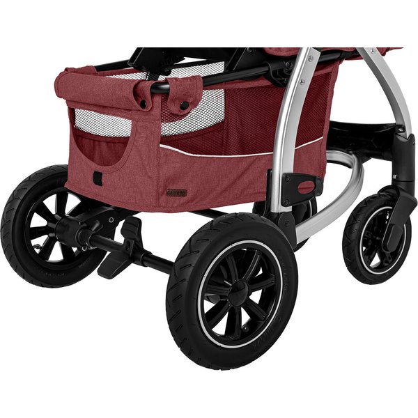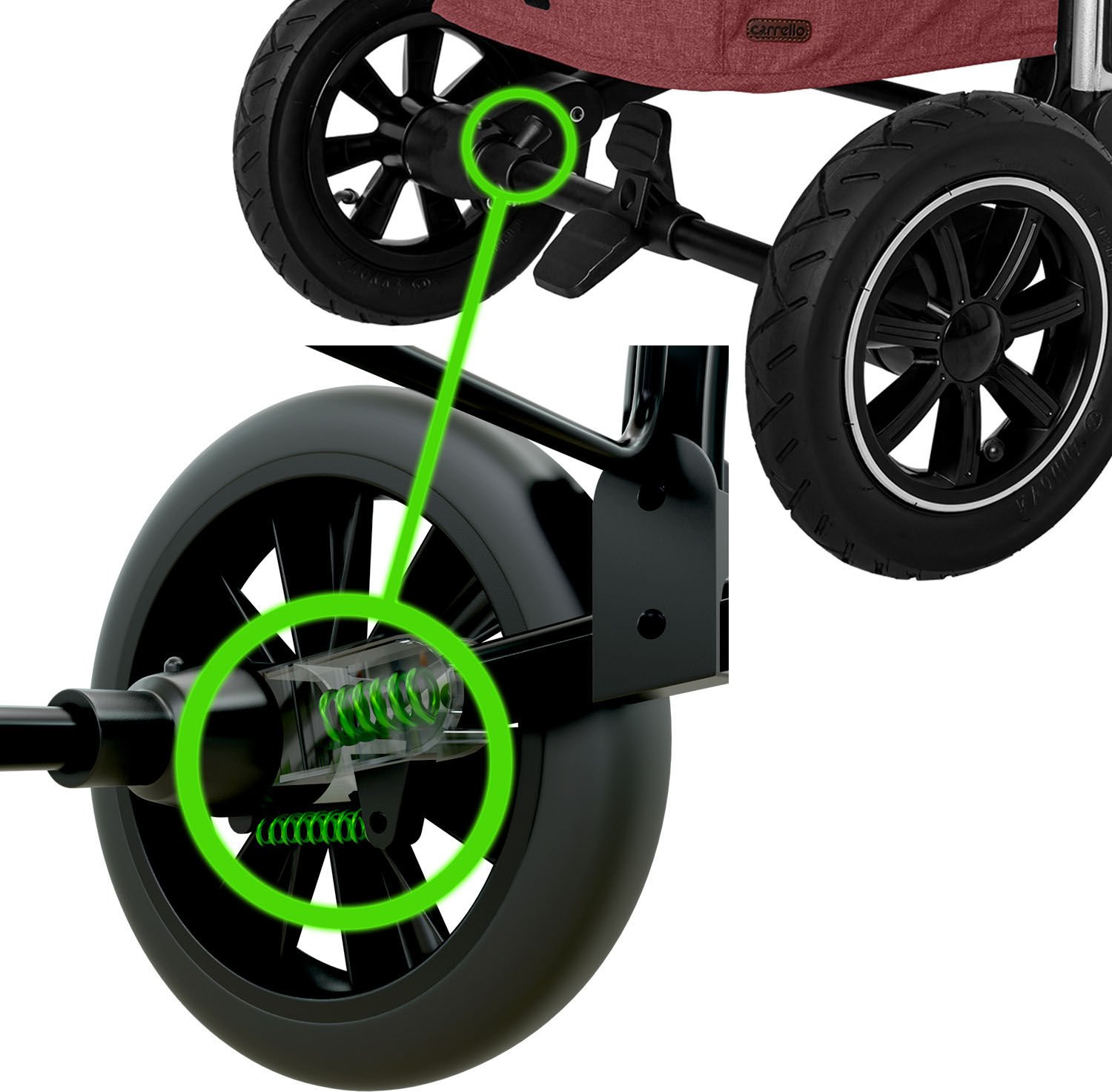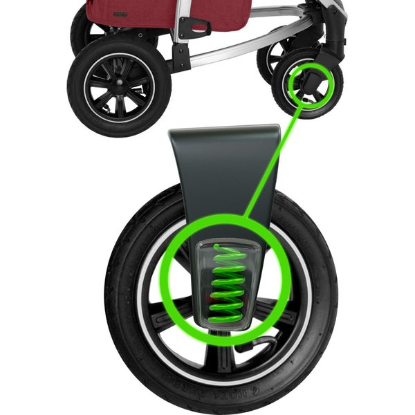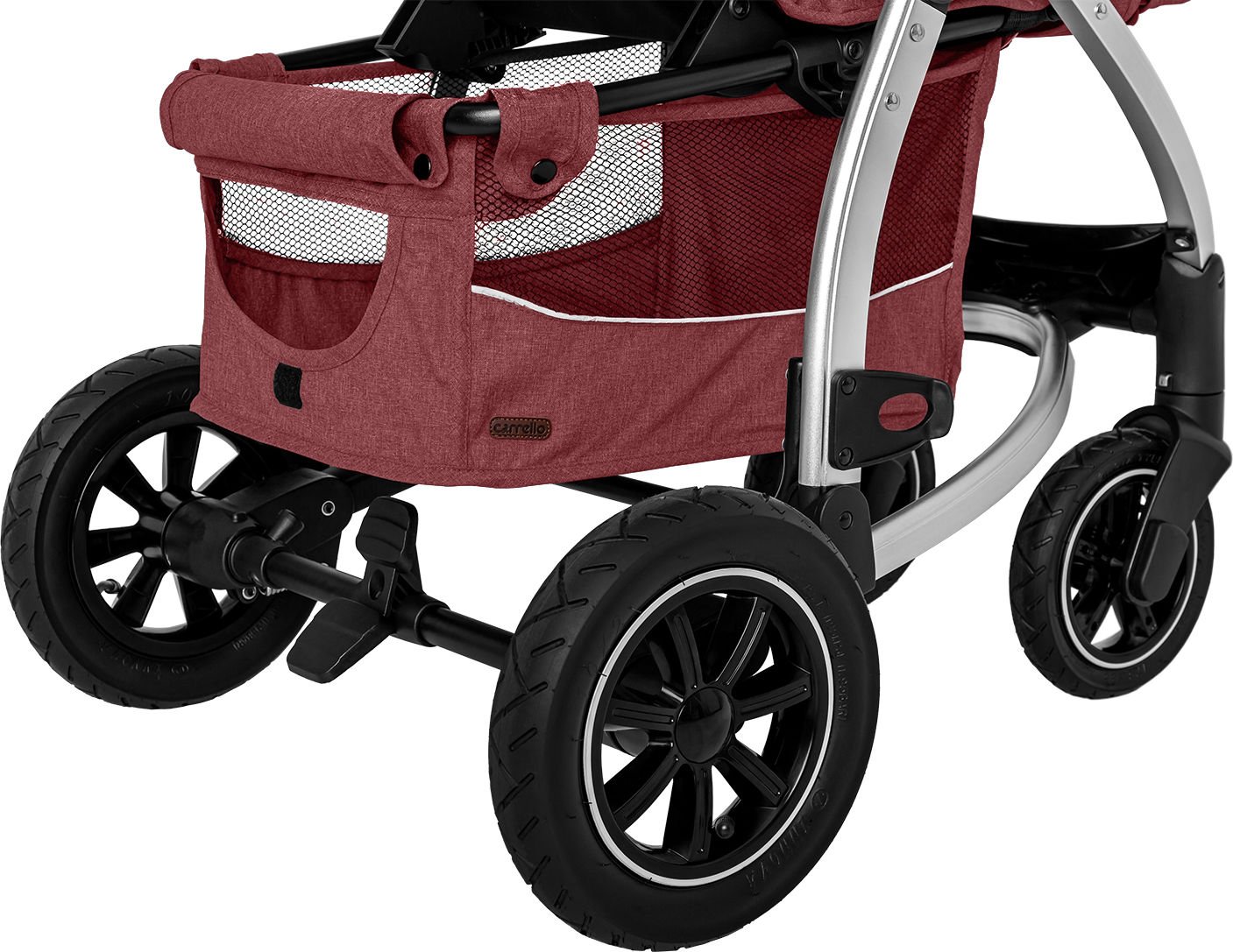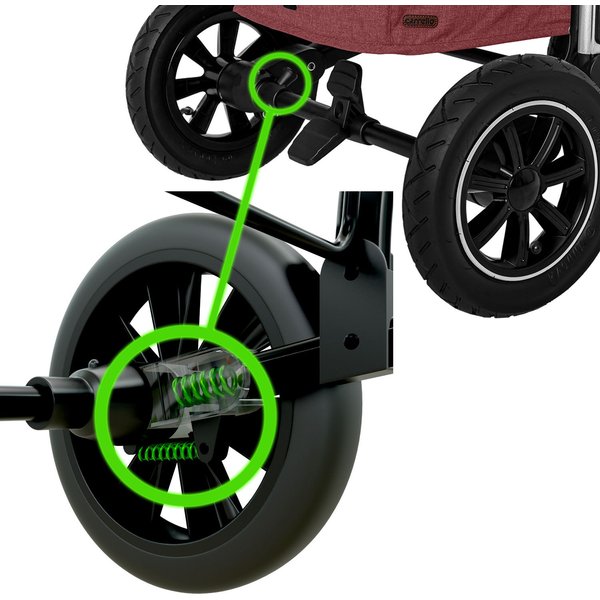Dużym atutem wózka są pompowane koła z amortyzacją sprawiające, że każdy spacer będzie przyjemny nawet na nierównej nawierzchni. Zdejmowana tapicerka jest łatwa w utrzymaniu czystości dzięki możliwości prania. Twoja pociecha może smacznie spać w komfortowej gondoli o bawełnianym wnętrzu i z miękkim materacykiem. W upalne dni warto otworzyć siateczkowe okienko wentylacyjne, aby zapewnić maluszkowi dopływ świeżego powietrza. Także siedzisko spacerówki posiada okienko obserwacyjne i wentylacyjne obszyte siateczką. Ważną zaletą spacerówki jest możliwość regulacji podnóżka oraz oparcia (także do pozycji leżącej).
