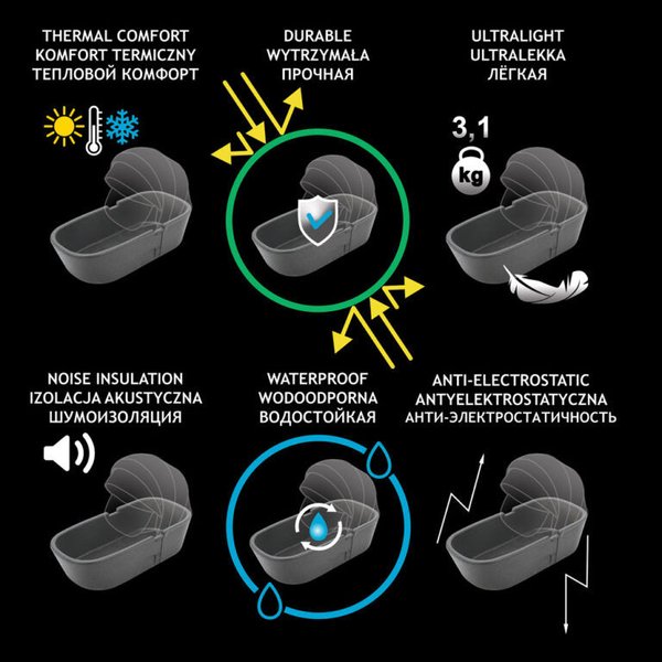 Jego gondola została wykonana jest z innowacyjnego tworzywa EPP, dzięki czemu jest wyjątkowo lekka (tylko 3,1 kg), ale także bardzo wytrzymała. Ponadto wykazuje właściwości izotermiczne, chroni maluszka przed nadmiernym hałasem i jest antyelektrostatyczna. Gondolę wyposażono w komfortowy materac kokosowy oraz poszerzaną budkę. Wydajny system wentylacji to z kolei coś, co umożliwi spacery nawet podczas dużych upałów.