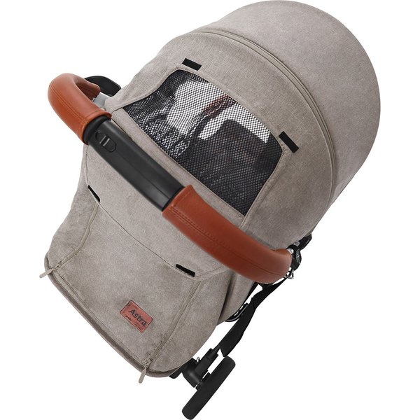 Obszerny daszek przeciwsłoneczny z dużym okienkiem wentylacyjnym chroni przed słońcem i deszczem. Trwała tapicerka posiada impregnację i ochronę przed kapaniem.