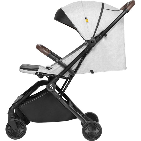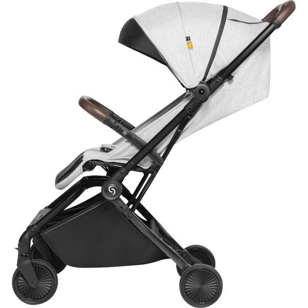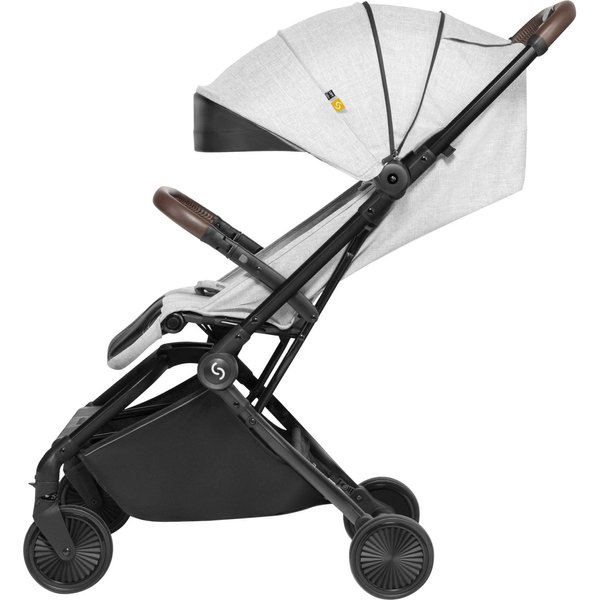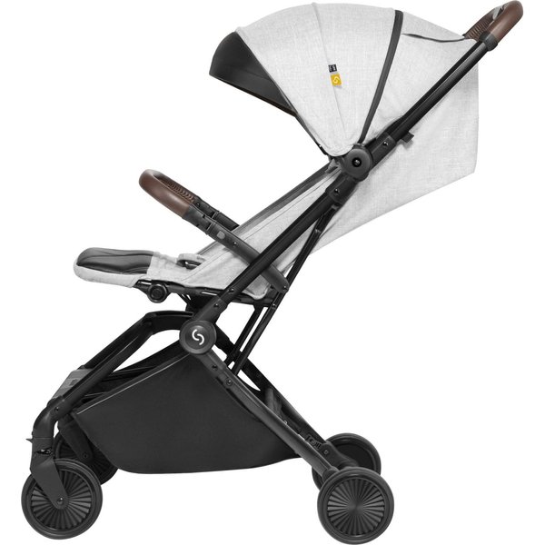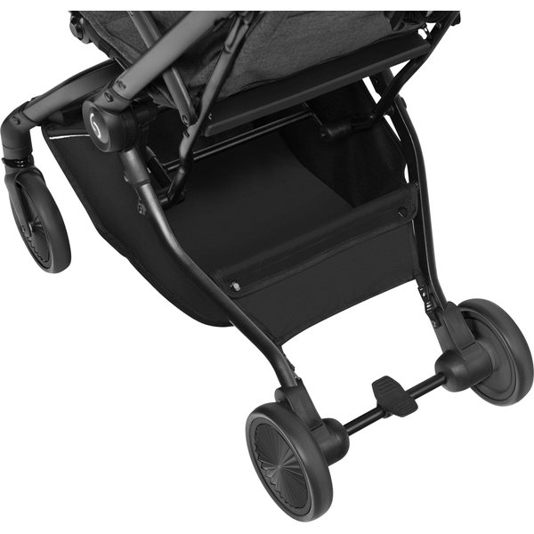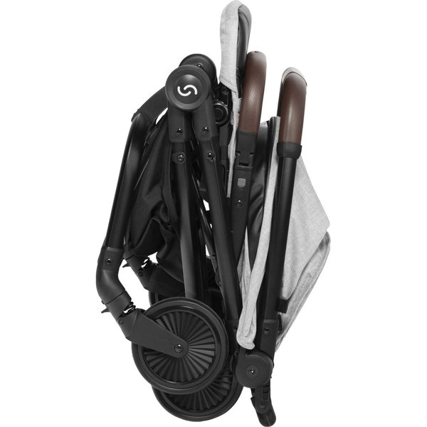 Wózek ma lekką, aluminiową konstrukcję, a dzięki kompaktowym rozmiarom po złożeniu z łatwością zmieści się nawet w mniejszym aucie i samolocie. System automatycznego składania pozwala na szybkie złożenie wózka jedną ręką.