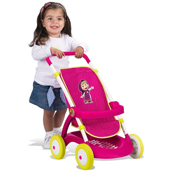Teraz każda księżniczka może zabrać swoją ukochaną lalkę na spacer i poczuć się jak prawdziwa mama. Wózek jest lekki i stabilny, stelaż wykonano zarówno z elementów metalowych, jak i plastikowych. Posiada materiałowe siedzisko z wizerunkiem Maszy, barierkę zabezpieczającą przed wypadnięciem, a także półkę na akcesoria pod siedziskiem.