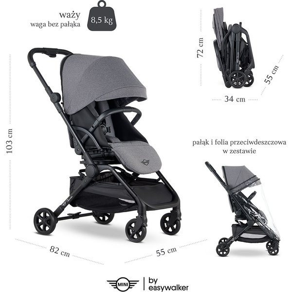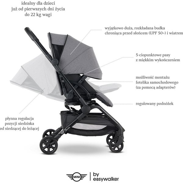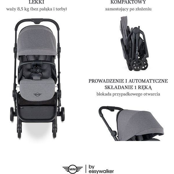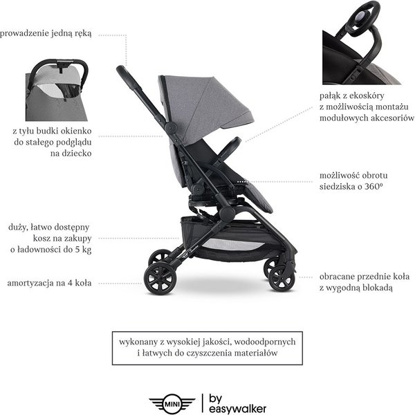 Zwraca uwagę nietypowy design wózka, przywodzący na myśl… samochód Mini. To nie przypadek - marka BMW współpracowała z Easywalker przy projektowaniu tej spacerówki. Wysokiej klasy wózek posiada lekki, anodyzowany stelaż z aluminium oraz nieprzebijalne koła z amortyzacją, gwarantujące bezproblemową jazdę nawet po wertepach miejskiej dżungli lub wiejskich ścieżkach. Łatwo i szybko złożysz go za pomocą jednej ręki wraz z siedziskiem.