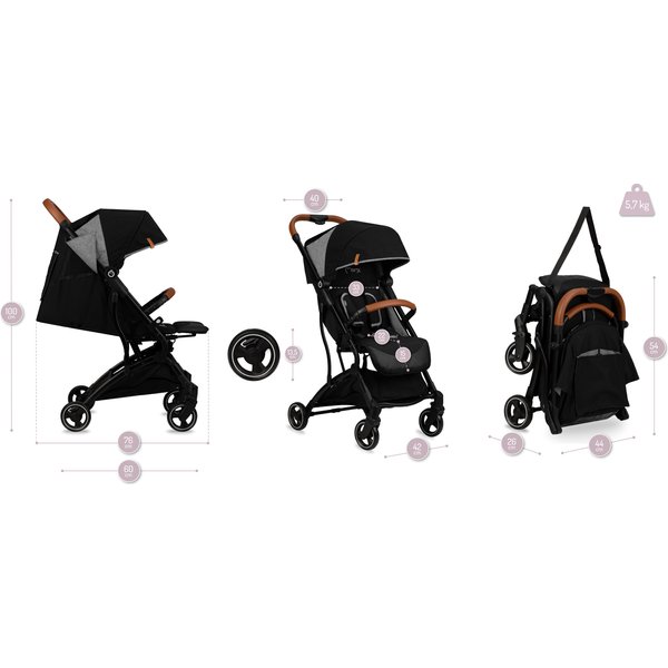 Dużym atutem wózka są także bardzo zwrotne koła z pianki poliuretanowej, którym nie grozi przebicie. Wszystkie koła posiadają amortyzację, aby jazda po wertepach nie była dla małego podróżnika przykrym doświadczeniem. O bezpieczeństwo maluszka zadbają pięciopunktowe pasy bezpieczeństwa i odpinany pałąk. Wykończenie z ekoskóry na podnóżku, pałąku i rączce dodaje wózkowi elegancji, praktyczności i spotka się z uznaniem wymagających użytkowników. Oparcie wózka posiada niezbędną regulację, aby dziecko mogło się w nim zdrzemnąć. Dla aktywnych rodziców ważne jest, aby wózek miał kompaktowe rozmiary po złożeniu i mieścił się w samochodowym bagażniku. Taki jest właśnie model Ofra, który dodatkowo posiada jeszcze funkcję stania w pionie po rozłożeniu i pas do noszenia wózka. W zestawie z wózkiem jest także uchwyt na kubek, w którym można przewozić kawę lub butelkę z napojem. Pojemny kosz na zakupy pomieści zabawki lub akcesoria dziecięce.