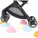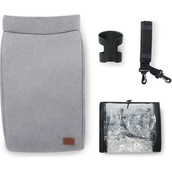 W zestawie znajdują się takie akcesoria jak: śpiworek na nóżki, uchwyt na kubek, pas do przenoszenia, folia przeciwdeszczowa, pojemny kosz.