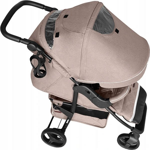 Przednie koła posiadają blokadę skrętu, a w tyle znajduje się hamulec, który pomoże Ci zadbać o bezpieczeństwo. Budka posiada rozkładany daszek z okienkiem wentylacyjnym, umożliwiającym lepszy przepływ powietrza w czasie upalnych dni. Trwała tapicerka posiada impregnację, a daszek blokadę przed kapaniem.